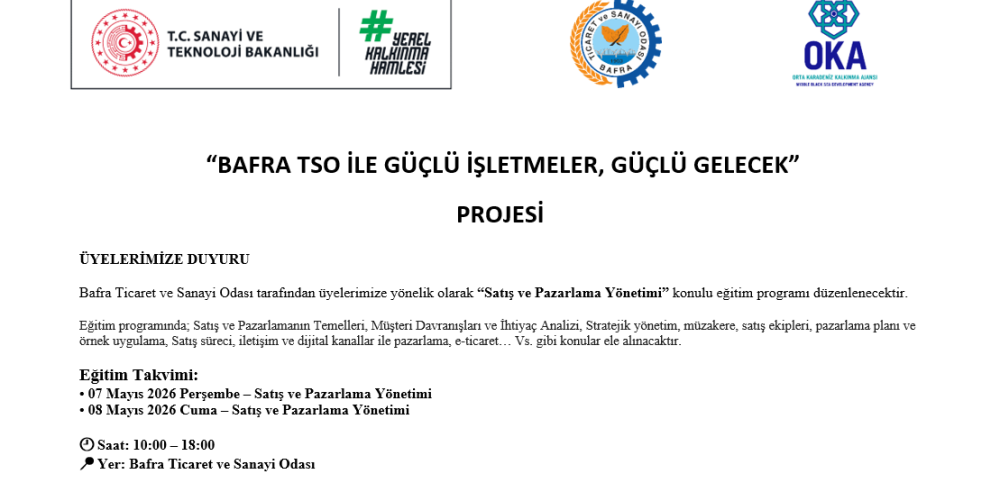 Sayın Üyemiz,Odamız tarafından 7 ve 8 Mayıs 2026 tarihleri arasında "Satış ve Pazarlama Yönetimi" konularında eğitimler gerçekleşecektir.