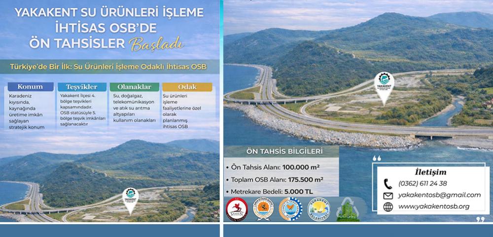 Karadeniz kıyısında stratejik bir konumda yer alan ve tamamen su ürünleri işleme faaliyetlerine yönelik planlanan Yakakent Su Ürünleri İşleme İhtisas OSB’nin, bölgenin su ürünleri sektöründeki üretim ve ihracat potansiyelini üst seviyeye taşıması hedeflenmektedir. Bölgede su, doğalgaz, telekomünikasyon ve atık su arıtma altyapılarının hazır olduğu, yatırımcılara önemli lojistik ve üretim avantajları sunduğunu belirtmek isteriz.